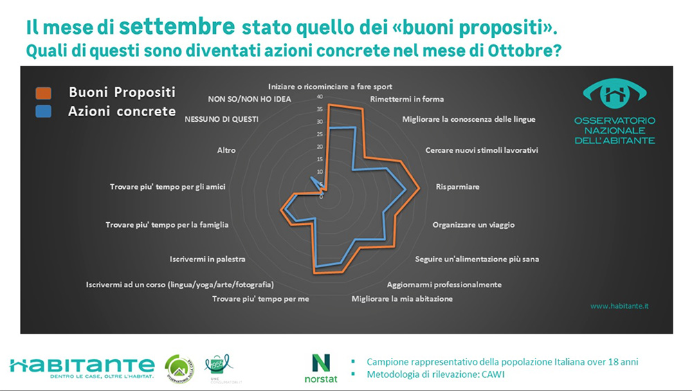 Questa la fotografia di quello che gli abitanti hanno deciso di fare concretamente ad ottobre. Se, però, confrontiamo questi dati con la rilevazione di settembre dove avevamo chiesto di dirci quali fossero i buoni propositi al rientro dalle vacanze estive. E, dunque, la cosa che subito salta all’occhio è che rispetto a quanto immaginato a settembre ad ottobre pare che buona parte della spinta verso il rinnovamento si sia affievolita. Questo sta indicare come in fondo la tendenza al cambiamento e all’innovazione degli italiani sia meno forte rispetto a quanto effettivamente viene dichiarato. In particolare, si denota come la vera resistenza al cambiamento sia più rivolta a se stessi piuttosto che verso gli altri. Si tende, infatti, a cercare prima di tutto ad adattarsi, trovare delle vie alternative o motivazioni fuori da sé invece di adottare comportamenti personali completamente nuovi e che portano ad un vero cambiamento profondo della propria condizione personale. Stressando il concetto piassimo direi che “se gli obiettivi non vengono raggiunti non dipende da me ma dal contesto in cui sono inserito”. La responsabilità personale lascia spazio a quella collettiva generando un immobilismo sociale ed economico ormai endemico da alcune generazioni.