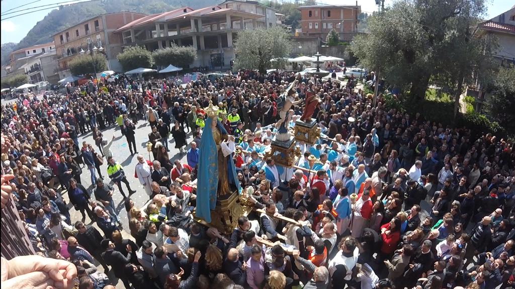 Dasà è l’antico villaggio di Arena, patria di San Lorenzo dell’Istituto di san Basile Magno, il nome di chiara identità greca significa luogo selvoso. In questo piccolo centro delle serre vibonesi con poco più di mille abitanti si svolgi la tradizionale manifestazione della ‘Ncrinata, una delle manifestazioni di pietà popolare più antiche e partecipate della Pasqua calabrese. Esattamente il martedì dell’ottava di Pasqua, in cui fede e identità si uniscono e tutto rinsalda i vincoli della pace, della speranza rinnovata, della fede, del rialzarsi e incamminarsi con nuovo sentire spirituale. a ‘Ncrinata di Dasà è una delle manifestazioni religiose più suggestive della Calabria che si ripete da oltre tre secoli, rappresenta l’incontro tra la Madonna della Consolazione e Cristo risorto, simboleggiando la vittoria della vita sulla morte. Il focus della ‘Ncrinata è l’incontro tra le statue della Madonna e del Cristo, accompagnato da un tripudio di emozioni: urla di gioia, abbracci e lacrime liberatorie. Tradizionalmente, la statua della Madonna indossa un manto nero del lutto, che viene rimosso durante l’incontro, segnando simbolicamente la fine del dolore e l’inizio della gioia pasquale. La processione si snoda tra le vie del paese secondo un percorso ormai segnato dalla tradizione, molti dei fedeli percorrono il tragitto penitente scalzi. Puntualmente, ogni anno, numerosi partecipanti vengono all’appuntamento con la Ncrinata dai luoghi dell’emigrazione come Usa, Canada, Australia per onorare un voto o rendere grazie per una grazia ricevuta. Per preservare e celebrare questa tradizione, l’amministrazione comunale di Dasà ha avviato la creazione di un museo dedicato alla ‘Ncrinata. La ‘Ncrinata di Dasà non è solo un evento religioso, ma un’esperienza collettiva che unisce la comunità e i visitatori in un’espressione di fede, cultura e identità calabrese. Scrive la studiosa Maria Teresa Mara Francese (2014): “La religiosità viene vissuta quindi come risolutrice dei problemi della quotidianità, affidandosi alla componente magico-religiosa come elargizione misteriosa del divino”. Ed ancora “La statua della Madonna Addolorata pellegrina nella Settimana Santa è sostituita dalla statua della Madonna della Consolazione nel primo pomeriggio del lunedì dopo Pasqua in cui si trova ancora nella sua nicchia sopra l’altare maggiore (nella chiesa omonima) dove si prepara alla scinduta (alla discesa) per mano di alcuni uomini che la sistemano su una piattaforma, in presenza dei fedeli riuniti per l’evento. Una volta fissata saldamente alla vara, alla Madonna viene tolto Gesù Bambino dal braccio sinistro e al suo posto viene legato il fazzoletto del lutto: a questo punto la Madonna è pronta per essere vestita a lutto. Rimossa la corona d’argento viene posto sul capo il primo mantello azzurro, della resurrezione, fissato saldamente, sopra il quale, con abile maestria di intrecci di fili, viene appoggiato il mantello nero del lutto che cadrà durante l’Ncrinata”. Il fazzoletto è di colore bianco con recami in oro e con la lettera centrale di una M. Si tratta di un dono votivo che puntualmente le famiglie dasaesi offrono alla Santa Vergine come pegno per una richiesta di grazia o scioglimento di una grazia. Il parroco del paese Don Bernardino Comerci, figura molto sensibile al valore evangelico e di fede secondo i canoni popolari, oggi parroco di Maierato, per diversi anni ha seguito molto da vicino questa profonda tradizione popolare al punto che ritrovati dei fazzoletti votivi ha voluto realizzare una mostra in segno della profonda fede verso la Madonna che ha perso e ritrovato il suo unico Figlio. Dice Don Bernardino “il fazzoletto bianco, è l’ultimo dei segni che viene messo alla madonna il lunedì quando si prepara. C’è una devozione particolare a Dasà verso il fazzoletto, tanto è vero che io quando sono arrivato avevo prenotazioni per oltre dieci anni dopo di me. Ogni anno viene preparato questo fazzoletto da una devota come ex-voto e quindi viene preparato proprio ad oc e messo nelle mani della madonna. […] tra l’altro è un segno che viene messo alla Addolorata il Venerdì Santo. È il segno con cui la Madonna asciuga le lacrime dei suoi figli. Il fazzoletto rimane anche dopo la Ncrinata: cade il mantello nero ma il fazzoletto bianco o dorato rimane. La Madonna attraverso il fazzoletto raccoglie le lacrime dei suoi figli trasformando quelle lacrime di dolore che Lei custodisce in lacrime di gioia”.