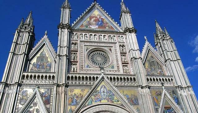 Orvieto è una città ricca di storia e di tradizioni. Una delle sue maggiori attrazioni è la basilica cattedrale di Santa Maria Assunta, principale luogo di culto cattolico di Orvieto, capolavoro dell’architettura gotica dell’Italia Centrale. La basilica di Orvieto risale al 1290 quando Papa Niccolò IV creò un’unica grande cattedrale al posto delle due chiese che preesistevano sulla piazza. La direzione dei lavori fu affidata a fra Bevignate da Perugia a cui succedette Giovanni di Uguccione, che introdusse le prime forme gotiche. Ai primi anni del Trecento lo scultore e architetto senese Lorenzo Maitani assunse il ruolo di capomastro dell’opera. Questi ampliò in forme gotiche l’abside e il transetto e determinò, pur non terminandola, l’aspetto della facciata come appare ancora oggi. Nel 1350-1356 venne costruita la Cappella del Corporale. Nel 1408-1444 venne costruita la Cappella di San Brizio, affrescata tra il 1447 e il 1504. Anche i lavori della facciata si protrassero negli anni, fino ad essere completati solo nella seconda metà del 1500 da Ippolito Scalza, che costruì tre delle quattro guglie della facciata.
