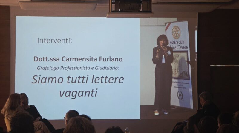Una sala gremita ed una platea attenta verso un argomento delicato elaborato grafologicamente. Un viaggio dal quadro di Munch 1892 ai nostri giorni, nel disagio relazionale dell’essere umano: “Siamo tutti Lettere Vaganti”. Ogni essere umano ha provato del disagio relazionale, sia nei propri confronti che verso gli altri. Con la lente del Grafologo per comprendere il viaggio dell’io, la prima lettera vergata, nella scrittura. Grazie a Sabrina -Av.to- Pizzicaria Presidente Rotary Club Sabina Tevere, per aver voluto la mia presenza. E grazie ai partecipanti.