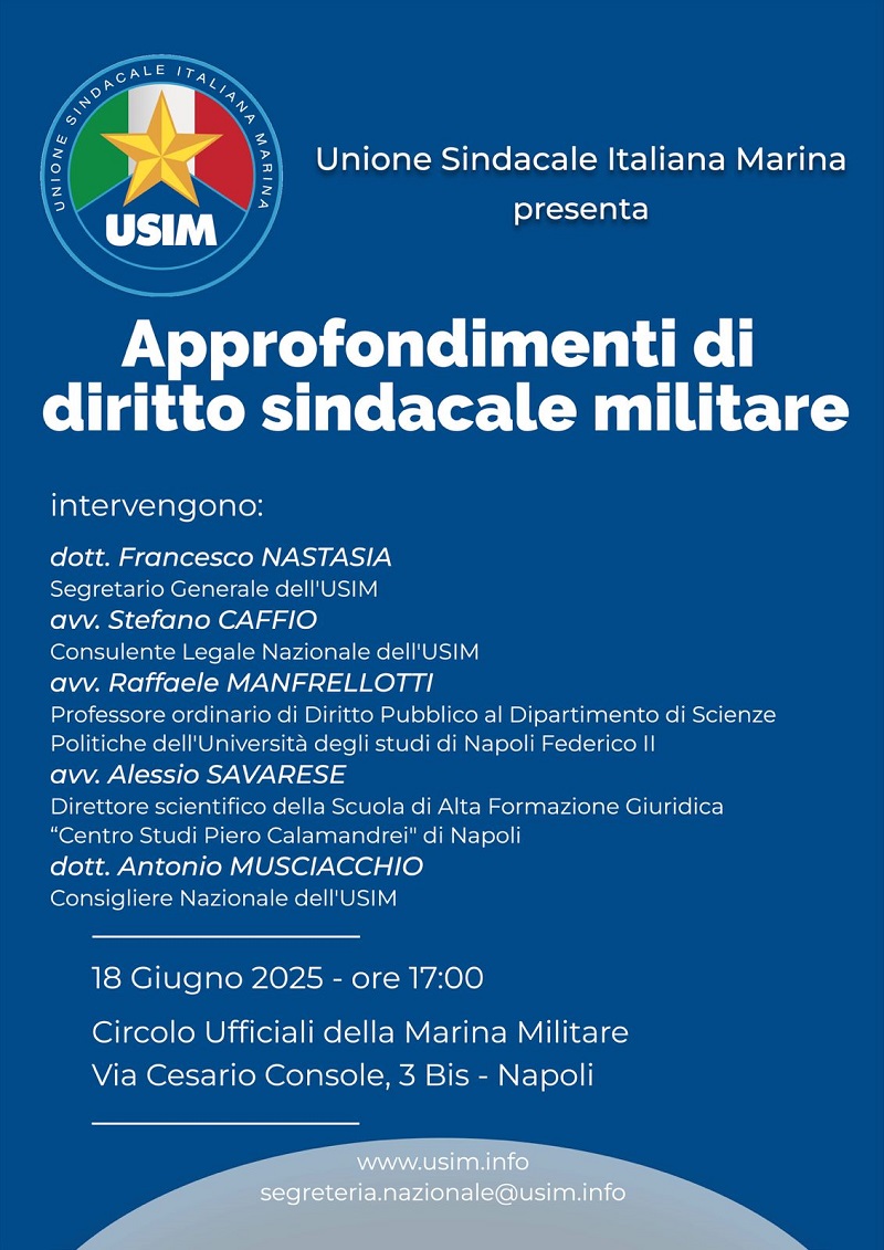 L’USIM – Unione Sindacale Italiana Marina in una nota stampa informa che si terrà il convegno dal titolo “Approfondimenti di diritto sindacale militare”, in programma il 18 giugno 2025 alle ore 17:00, presso la sala conferenze del Circolo Ufficiali della Marina Militare di Napoli.