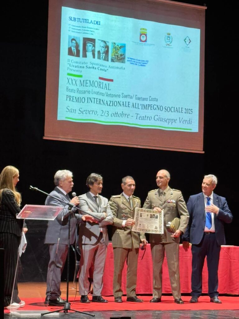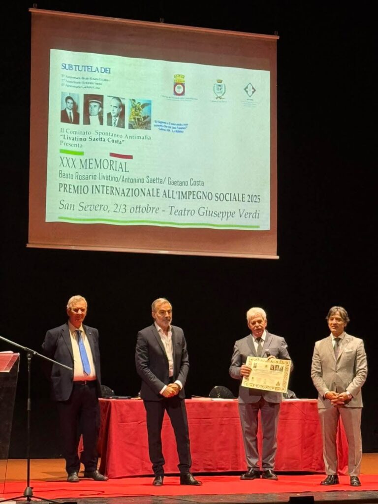 Si è svolta presso il Teatro Verdi di San Severo, la cerimonia di premiazione del XXX Memorial “Beato Rosario Livatino – Antonino Saetta – Gaetano Costa”, un evento di grande rilievo internazionale promosso dal Comitato Spontaneo Antimafia – Sede di Puglia, con Cosimo Forina, presidente per la Puglia e il dott. Angelo Jannone, vicepresidente, e organizzata dal Cav. Uff. Riccardo Di Matteo, presidente di Sinergitaly e APAMRI (Associazione Parlamentare di Amicizia con gli Insigniti della Repubblica Italiana), con il patrocinio del Comune di San Severo, che ha ospitato l’evento.