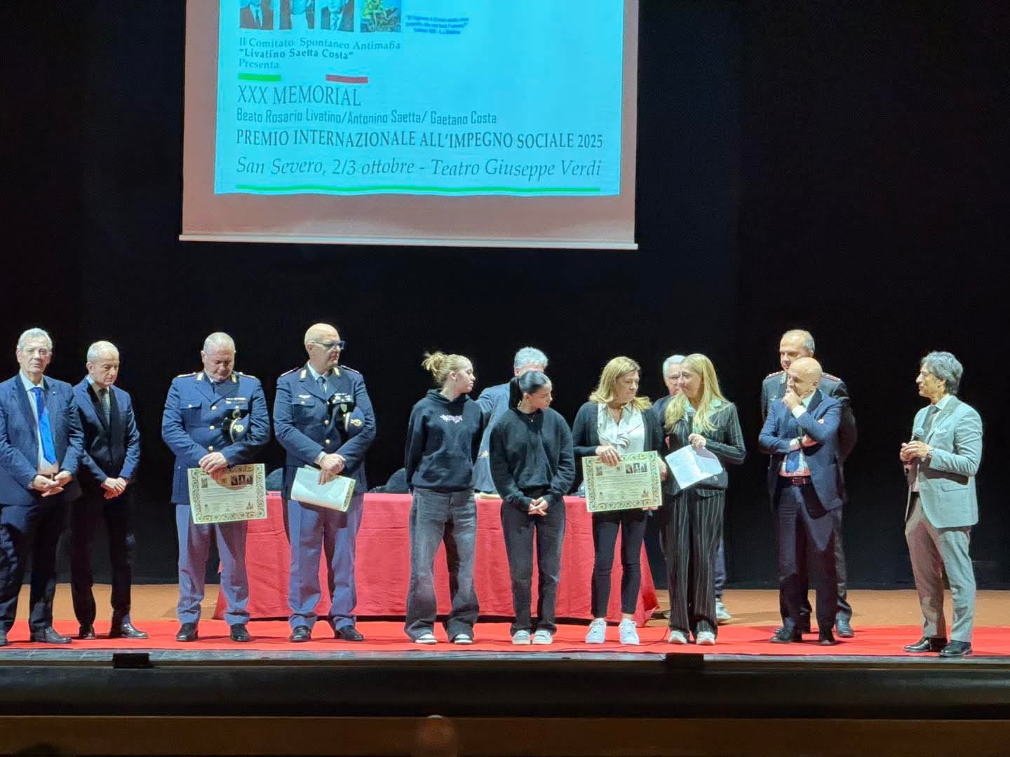 Si è svolta presso il Teatro Verdi di San Severo, la cerimonia di premiazione del XXX Memorial “Beato Rosario Livatino – Antonino Saetta – Gaetano Costa”, un evento di grande rilievo internazionale promosso dal Comitato Spontaneo Antimafia – Sede di Puglia, con Cosimo Forina, presidente per la Puglia e il dott. Angelo Jannone, vicepresidente, e organizzata dal Cav. Uff. Riccardo Di Matteo, presidente di Sinergitaly e APAMRI (Associazione Parlamentare di Amicizia con gli Insigniti della Repubblica Italiana), con il patrocinio del Comune di San Severo, che ha ospitato l’evento.