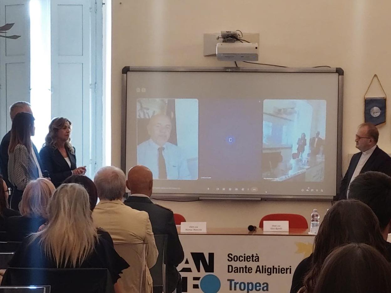 In collegamento video, il Magnifico Rettore dell’Università Magna Graecia di Catanzaro, Prof. Gianni Cuda, ha espresso la gioia dell’Ateneo per il riconoscimento ottenuto dal giovane Comitato Dante tropeano, sottolineando la volontà di collaborare attivamente. Parole di incoraggiamento e disponibilità sono giunte anche dal Prorettore dell’Università Mediterranea di Reggio Calabria, Prof. Felice Arena, che ha ribadito l’importanza di investire nella cultura come strumento di crescita territoriale.