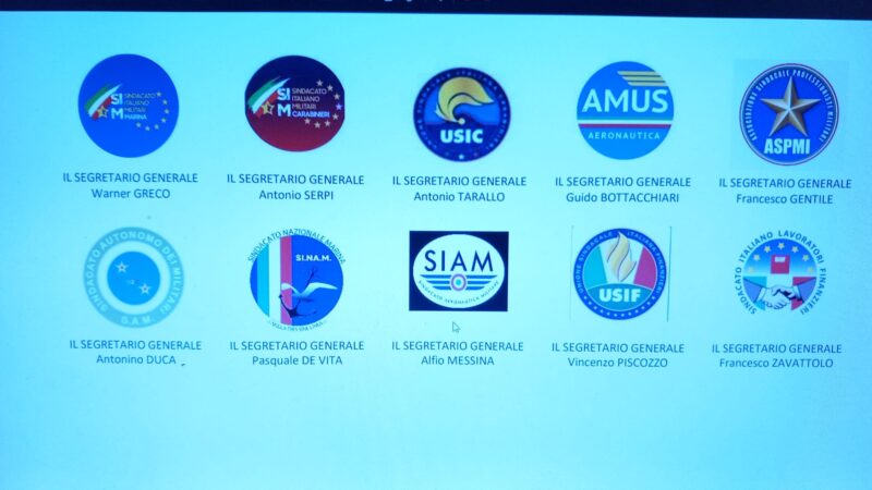 Warner GRECO “SIM” Sindacato Italiano Militari Marina – Antonio SERPI “SIM” Sindacato Italiano Militari Carabinieri – Antonio TARALLO “USIC” Unione Sindacale Italiana Carabinieri – Guido BOTTACCHIARI “AMUS” Aeronautica – Francesco GENTILE “ASPMI” Associazione Sindacale Professionisti Militari – Antonino DUCA “SAM” Sindacato Autonomo dei Militari -Pasquale DE VITA “SI.NA.M” Sindacato Nazionale Marina – Alfio MESSINA “SIAM” Sindacato Aeronautica Militare – Vincenzo PISCOZZO “USIF” Unione Sindacale Italiana Finanzieri – Francesco ZAVATTOLO “SILF” Sindacato Italiano Lavoratori Finanzieri .