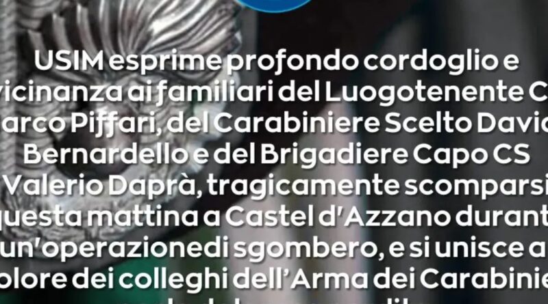 L’USIM – Unione Sindacale Italiana Marina esprime il più profondo cordoglio e vicinanza ai familiari del Luogotenente Carica Speciale Marco Piffari, del Carabiniere Scelto Davide Bernardello e del Brigadiere Capo Qualifica Speciale Valerio Daprà, che hanno sacrificato la propria compiendo il loro dovere al servizio della collettività. L’esplosione avvenuta questa mattina in un casolare di Castel d’Azzano (Verona), durante un’operazione di sgombero, ha inoltre causato il ferimento di altri 11 carabinieri, tre poliziotti e un vigile del fuoco che fortunatamente non sarebbero in pericolo di vita, ai quali va la nostra vicinanza e l’augurio di pronta guarigione. USIM si unisce al dolore dei colleghi dell’Arma dei Carabinieri per questa terribile perdita.