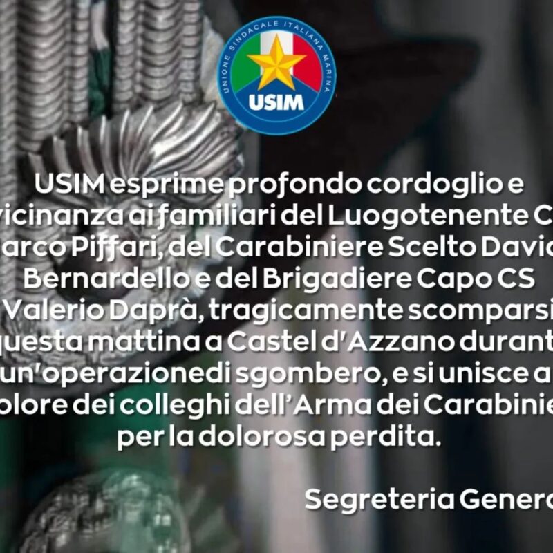 L’USIM – Unione Sindacale Italiana Marina esprime il più profondo cordoglio e vicinanza ai familiari del Luogotenente Carica Speciale Marco Piffari, del Carabiniere Scelto Davide Bernardello e del Brigadiere Capo Qualifica Speciale Valerio Daprà, che hanno sacrificato la propria compiendo il loro dovere al servizio della collettività. L’esplosione avvenuta questa mattina in un casolare di Castel d’Azzano (Verona), durante un’operazione di sgombero, ha inoltre causato il ferimento di altri 11 carabinieri, tre poliziotti e un vigile del fuoco che fortunatamente non sarebbero in pericolo di vita, ai quali va la nostra vicinanza e l’augurio di pronta guarigione. USIM si unisce al dolore dei colleghi dell’Arma dei Carabinieri per questa terribile perdita.