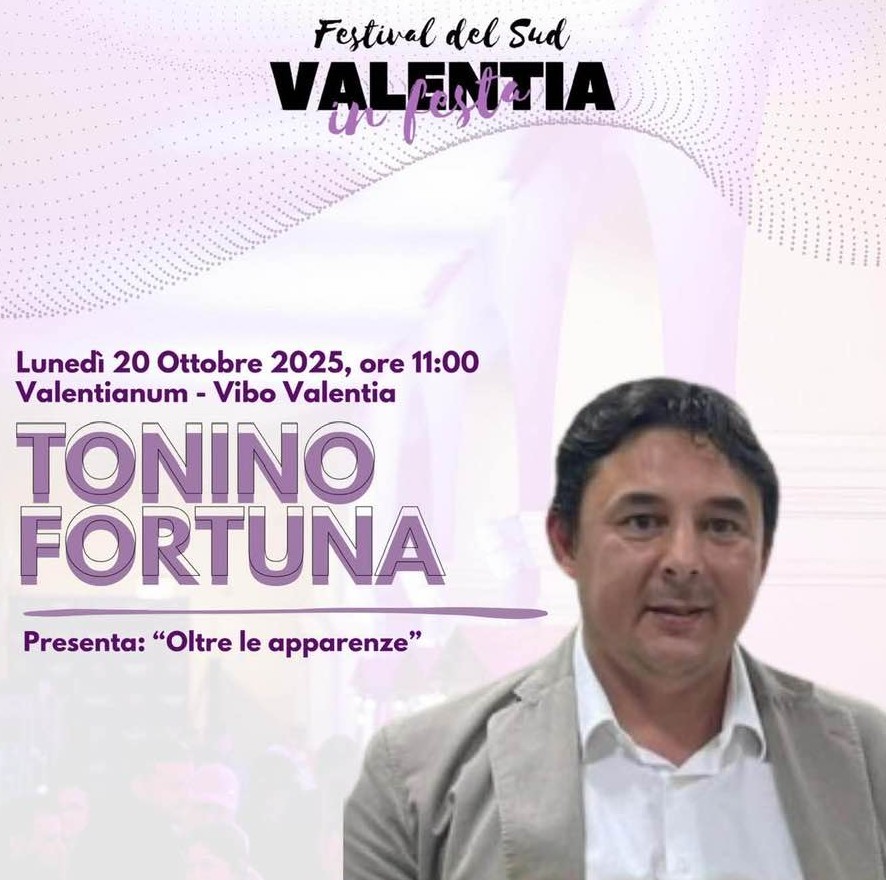 All’interno del programma del Festival del Sud, si terrà la presentazione della raccolta poetica Oltre le apparenze di Tonino Fortuna, edita da Libritalia Edizioni. L’appuntamento è fissato per lunedì 20 ottobre presso la Sala Teatrino del Valentianum, di Vibo Valentia.