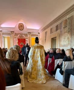 Alle 18.15, nella cappella gentilizia ha avuto inizio l’ accoglienza ufficiale della illustre ospite da parte di oltre 100 invitati, molti dei quali, in abito da chiesa. L’introduzione alla serata è stata mirabilmente curata dalla nostra associata, l’attrice e presentatrice, Isabel Russinova che ha delineato i tratti umani, formativi e culturali della regina Monet.