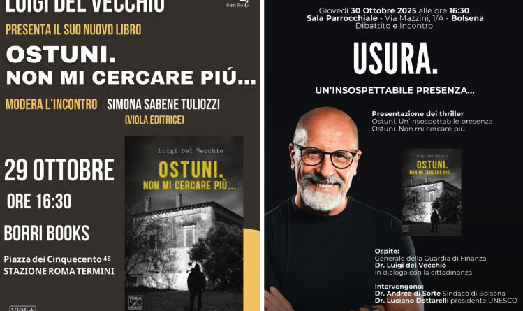 Il giorno successivo, giovedì 30 ottobre 2025, alle ore 16:30, a Bolsena, presso la Sala Parrocchiale di Via Mazzini 1/A, la fantasia e i thriller di Luigi Del Vecchio saranno il tema del convegno “Usura. Un’insospettabile presenza”. Un incontro pubblico dedicato al tema dell’usura e del sovraindebitamento, fenomeni dalle origini antiche e che rappresentano oggi una vera e propria emergenza sociale.