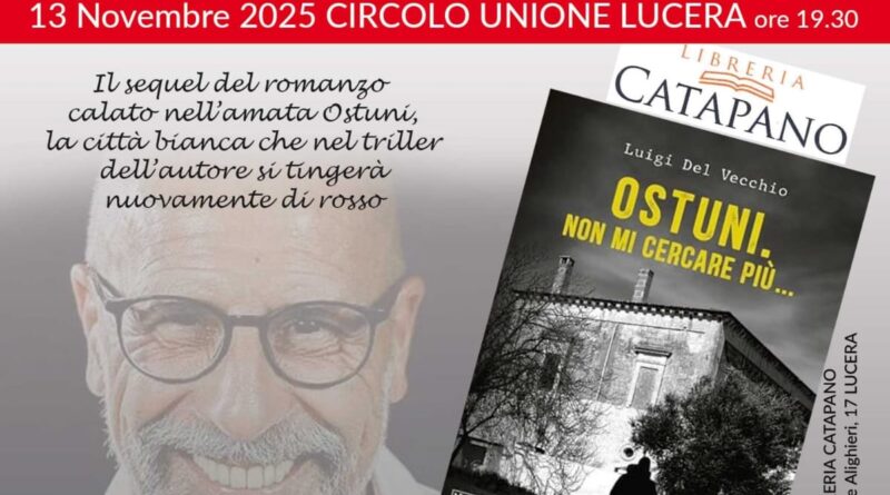 Il Circolo Unione di Lucera ospiterà giovedì 13 novembre, alle ore 19.30, la presentazione del nuovo romanzo di Luigi Del Vecchio, “Ostuni. Non mi cercare più…” (Viola Editrice), sequel del precedente successo “Ostuni, un’insospettabile presenza”, entrambi ambientati nella “città bianca”.