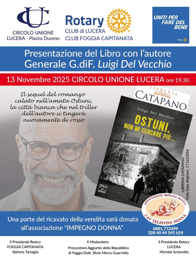 Il 13 novembre 2025, alle ore 19.30, il Generale di Brigata della Guardia di Finanza in congedo Luigi Del Vecchio torna a incontrare i lettori con il sequel ambientato nella “città bianca”. Un evento promosso dal Rotary Club di Lucera e Foggia Capitanata, con un gesto concreto di sostegno all’associazione “Impegno Donna”.