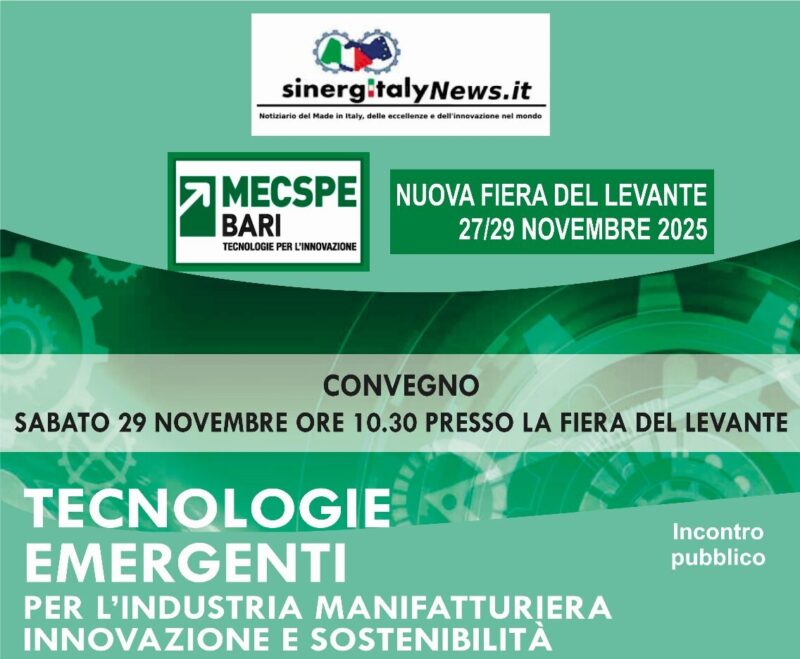 Si terrà sabato 29 novembre alle 10.30, nell’ambito di MECSPE Bari – Tecnologie per l’Innovazione, l’incontro pubblico dedicato alle tecnologie emergenti, all’evoluzione dei processi industriali e alle sfide della sostenibilità, con l’obiettivo di offrire una riflessione condivisa tra istituzioni, ricerca e sistema produttivo.