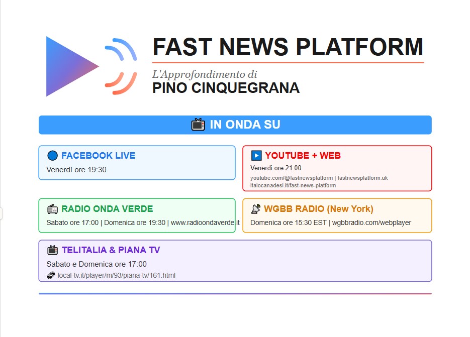 Vi diamo appuntamento venerdì 2 gennaio 2026, alle 19:30, su Facebook Live su Fast News Platform, per il nostro prossimo Approfondimento dedicato all’Epifania. Vi racconteremo le tradizioni che uniscono l’Italia, la Spagna, gli Stati Uniti, il Canada, il Sud America e tutte le comunità italiane all’estero.