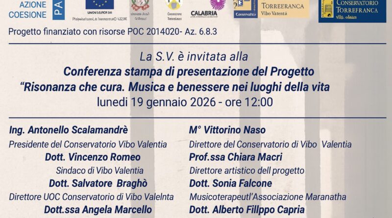 Vibo Valentia, 19 gennaio – Si è tenuta questa mattina, nella suggestiva Sala Concerti della nuova sede del Conservatorio Statale di Musica “Fausto Torrefranca” (ex Convento dei Gesuiti, via Scesa del Gesù 18), la conferenza stampa di presentazione del progetto “Risonanza che cura. Musica e benessere nei luoghi della vita”, iniziativa promossa dal Conservatorio e risultata vincitrice dell’Avviso Pubblico della Regione Calabria “Sostegno e promozione turistica e culturale” – Linea di Intervento 2 “Progetti culturali”.