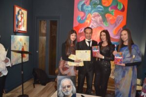 Un omaggio speciale è stato dedicato al padrone di casa, Francesco Logoteta, con una cornice in cristallo a ringraziamento dell’ospitalità in galleria e del contributo dato alla realizzazione di Corolle, l’opera che fa da copertina al volume Platinum: una potente metafora della genesi dell’esistenza, dove la natura esplode nei suoi colori più vivi e la vita sembra rinascere, petalo dopo petalo.