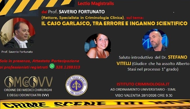 VIBO VALENTIA – Mercoledì 28 gennaio 2026, alle ore 10:00, l’Aula Magna dell’Istituto Criminologia.it ospiterà la Lectio Magistralis del Prof. Saverio Fortunato, Rettore e specialista in criminologia clinica, dedicata al tema: “Il Caso Garlasco: tra errore e inganno scientifico”.
