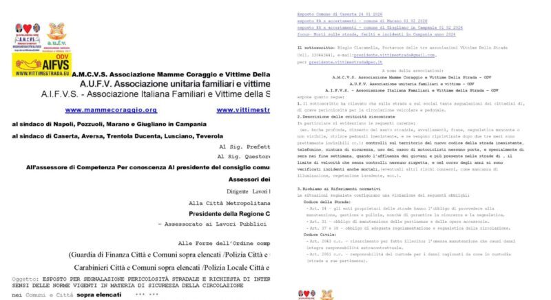 Il documento, indirizzato ai sindaci di Napoli, Pozzuoli, Marano, Giugliano, Caserta, Aversa, Trentola Ducenta, Lusciano e Teverola, al Prefetto e al Questore di Napoli e Caserta, all’Assessore competente, ai presidenti dei consigli comunali, ai dirigenti dei lavori pubblici e alle Forze dell’Ordine locali, denuncia la gravissima situazione di molte arterie stradali.