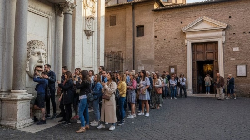 Quando ci si avvicina alla chiesa romana di Santa Maria in Cosmedin, si incontra una lunga fila di persone, soprattutto giovani, desiderosi di fotografarsi in coppia con la mano inserita nella Bocca della Verità. Fortunatamente, il parroco della chiesa ha aperto un’altra porta per chi vuole visitare il tesoro nascosto oltre il portone. Grazie a Dio, chi aspetta in fila per la scultura non entra in chiesa, permettendo così ai turisti interessati al patrimonio culturale di ammirare le eccellenze del santuario: la cripta, da cui si visitano le rovine del tempio dedicato a Ercole Pompeiano, i resti di una basilica del VI secolo con colonne e capitelli riutilizzati da altri edifici romani dei dintorni, e il mosaico dell’VIII secolo dell’Adorazione dei Re, proveniente dalla cappella papale di San Pietro.