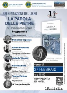 Il libro “La Parola delle Pietre” edito da Li Edizioni di Libritalia sara’ presentato venerdi 27 febbraio 2025 al 501 Hotel alle ore 18.00, in una serata che sara’ accompagnata dal pianoforte del Maestro Sergio Coniglio e commentata da importanti relatori.