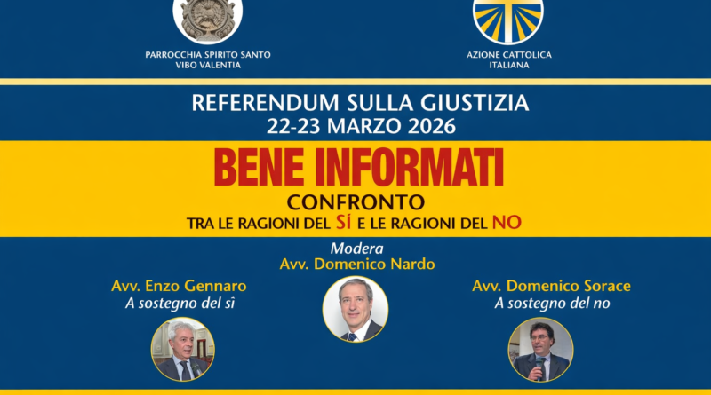 La Parrocchia Spirito Santo di Vibo Valentia e l’Azione Cattolica – Parrocchia Spirito Santo di Vibo Valentia promuovono un incontro pubblico dedicato al referendum sulla giustizia del 22 e 23 marzo 2026. L’appuntamento, intitolato “Bene Informati – Confronto tra le ragioni del sì e le ragioni del no”, si terrà martedì 17 marzo alle ore 18.30 nel Salone Parrocchiale di Santa Maria La Nova.