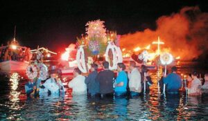Tutti si precipitano a rompere il digiuno con un pasto tradizionale composto da frutti di mare, polipo alla griglia con aceto, anelli di calamari, gamberoni serviti con le loro teste intatte, tutti cibi che rispettano l’astinenza della Quaresima.
