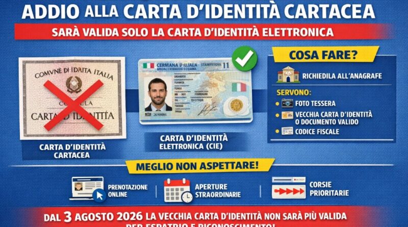Dal 3 agosto 2026 la storica carta d’identità cartacea non potrà più essere utilizzata come documento di riconoscimento, né per viaggiare all’estero, indipendentemente dalla data di scadenza riportata sul retro. La novità riguarda tutti i cittadini ancora in possesso del vecchio formato, che dovranno necessariamente sostituirlo con la Carta d’identità elettronica (Cie).