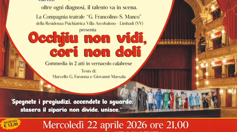 La stagione prosegue con un ultimo appuntamento fuori abbonamento, in programma mercoledì 22 aprile alle ore 21:00: Occhjiu non vidi, cori non doli, commedia in due atti in vernacolo calabrese proposta dalla compagnia teatrale “G. Francolino – S. Manco” della Residenza Psichiatrica Villa Arcobaleno di Limbadi.
