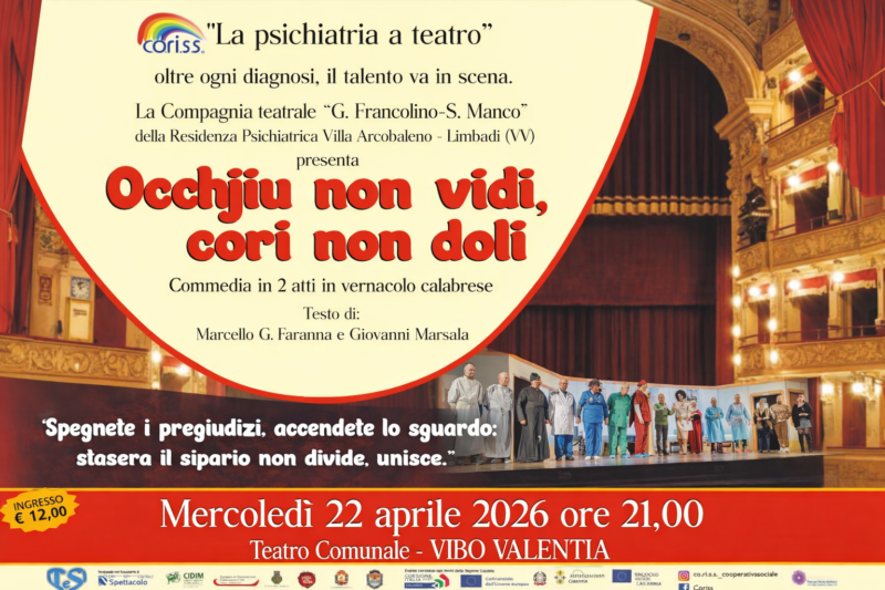 La stagione prosegue con un ultimo appuntamento fuori abbonamento, in programma mercoledì 22 aprile alle ore 21:00: Occhjiu non vidi, cori non doli, commedia in due atti in vernacolo calabrese proposta dalla compagnia teatrale “G. Francolino – S. Manco” della Residenza Psichiatrica Villa Arcobaleno di Limbadi.